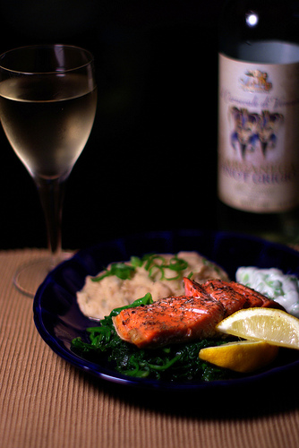 I sprinkled my fish with a little dried dill but you can use any herb you like. Fresh rosemary or parsley would also be good with salmon and even a little lemon zest would be nice…don’t be afraid to use your imagination. On the plate pictured, I served the baked salmon over a bed of fresh spinach sautéed with just a little olive oil and lemon juice. Along side is a white bean puree topped with a few green onion curls, lemon wedges, and a little creamy dill sauce. Dinner was on the table in about ½ hour and was elegant enough to serve to company.